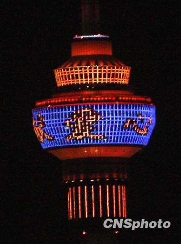 北京中央電視塔點(diǎn)亮愛(ài)心 哀悼玉樹(shù)地震遇難者