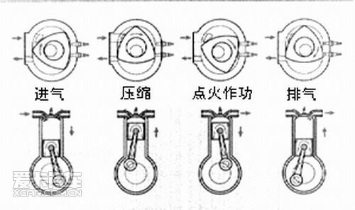 轉(zhuǎn)子的行進(jìn)路徑與呼吸測(cè)量?jī)x產(chǎn)生的軌跡類似。轉(zhuǎn)子的頂點(diǎn)與殼體接觸,從而形成三個(gè)獨(dú)立的氣室。轉(zhuǎn)子不停地圍繞燃燒室運(yùn)動(dòng),三種體積的氣體交替膨脹和收縮。正是這種膨脹和收縮將空氣和燃料吸入發(fā)動(dòng)機(jī),然后對(duì)此混合氣體進(jìn)行壓縮,并在氣體膨脹時(shí)生成有用的動(dòng)力,最后排出廢氣。