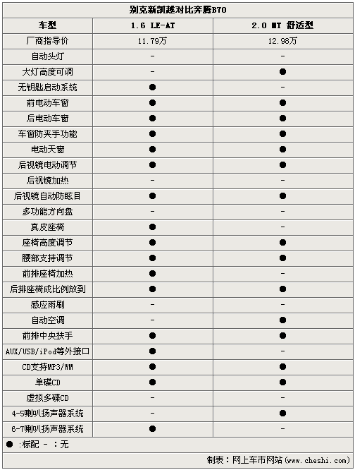 如果說今天對比的兩款車中,新凱越就是這個問題的答案。無鑰匙啟動系統(tǒng)、真皮包裹座椅、前排座椅加熱等高級配置同級別車型無人能及,比起高一級別的B70同樣體現(xiàn)出明顯的優(yōu)勢。AUX/USB/iPod外接音源和超過6個以上的車載音響系統(tǒng),吸引來喜愛音樂的朋友們不成問題。身為車系中的最低配版本,2.0 MT 舒適型的奔騰B70還是有比較亮眼的配置,可調(diào)大燈高度、自動空調(diào)等成為區(qū)別于新凱越的優(yōu)勢體現(xiàn)。