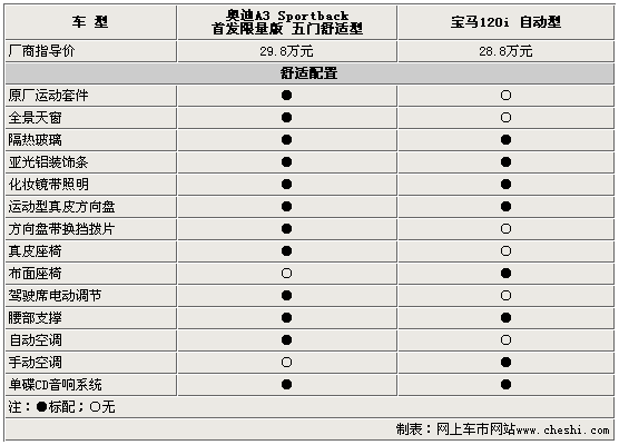 在舒適配置方面,入門的寶馬120i可能會讓你失望,常見的真皮座椅以及自動空調(diào)在這款“純運動”的車型身上均找不到。而相比之下奧迪A3 Sportback首發(fā)限量版就顯得更豪華了,這款新車裝配了部分奧迪原廠的“S-Line”運動套件,不僅視覺效果更運動,配置也提升了一個檔次。