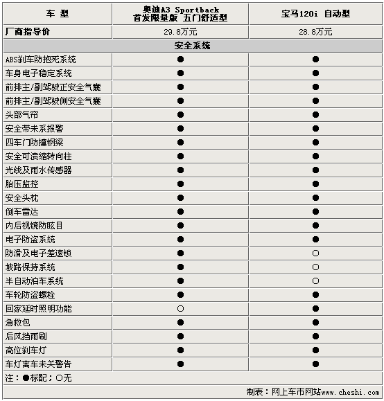作為高品質(zhì)的德系緊湊型兩廂運動小車,兩款車型在安全性方面均體現(xiàn)了很高的水準(zhǔn)。除了在這個級別中常見的前排正/側(cè)以及頭部安全氣簾外,奧迪A3 Sportback首發(fā)限量版在安全方面的配置要高于寶馬120i,也顯得更為豐富周全。奧迪A3 Sportback首發(fā)限量版所配備的:防滑電子差速鎖、坡路保持以及半自動泊車系統(tǒng)是既安全又實用的配置。