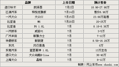 7月份上市的新車型中聚集了眾多知名大品牌。譬如一汽大眾、進口大眾、廣汽豐田等。而按照車型細分,其中涵蓋小型車、緊湊級車、以及中級車備受關(guān)注的SUV車型等,其中自足品牌占據(jù)了一半,達到了6款車型,分別是江淮和悅優(yōu)雅版比亞迪M6和F6 1.8;威姿V1;新駿捷;風行景逸,合資車型一汽大眾CC;新雅力士;三菱翼神;晶銳,進口車型鈴木凱澤西;尚酷R-line,共計12款車型。