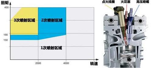 配合均質(zhì)燃燒模式的缸內(nèi)直噴技術(shù),在噴射邏輯上,根據(jù)不同的發(fā)動(dòng)機(jī)工況采取不同的多次噴射技術(shù),即一個(gè)發(fā)動(dòng)機(jī)點(diǎn)火循環(huán)中進(jìn)行多次噴射,更高效地形成混合氣。