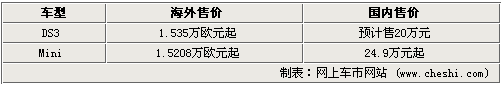 而在目前雪鐵龍DS系列車型僅有DS3一款,不出意外的話它將是長(zhǎng)安-標(biāo)致雪鐵龍推出的首款車型,預(yù)計(jì)將在2012年投產(chǎn)。DS3是一款雙門運(yùn)動(dòng)型小車,競(jìng)爭(zhēng)對(duì)手則是Mini,在歐洲地區(qū)的售價(jià)1.5萬(wàn)歐元起。Mini在國(guó)內(nèi)的售價(jià)為24.9萬(wàn)元起(海外售價(jià)同樣是1.5萬(wàn)歐元起),考慮到DS3國(guó)產(chǎn)的原因,它的售價(jià)很可能會(huì)在20萬(wàn)元左右,比Mini要便宜一些。而在國(guó)產(chǎn)前,這款車也在4月的北京車展上亮相過(guò),看來(lái)是早有國(guó)產(chǎn)準(zhǔn)備。