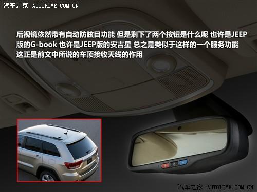車內(nèi)反光鏡上有三個按鈕,中間的為自動防眩目的開關(guān),那另外兩個是什么呢,或許是JEEP的“G-book”,或許是JEEP的“安吉星”,總之我們猜測就是類似于這兩個系統(tǒng)的一種服務(wù)功能,而上文提到的車頂天線應該就是該系統(tǒng)的接收模塊吧。