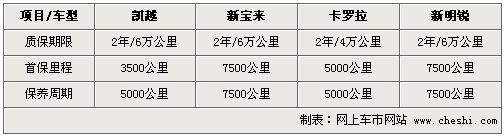 選擇的四款車型都是市場(chǎng)上相對(duì)銷量比較靠前的熱門車型,新凱越是別克旗下的緊湊級(jí)家用車,質(zhì)保期為2年/6萬公里,一個(gè)合資車比較常規(guī)質(zhì)保期限。同為2年/6萬公里還有一汽大眾品牌的新寶來,以及上海大眾斯柯達(dá)的新明銳。豐田卡羅拉是四款車型中唯一一款日系車型,2年/4萬公里的質(zhì)保期比較起來少有遜色。