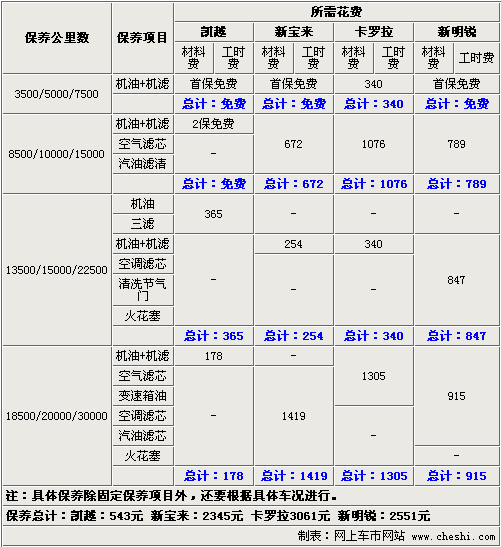 別克新凱越首保時(shí)間是四款車型中最短的,但廠家提供前兩次免費(fèi)保養(yǎng),這點(diǎn)看來還比較貼心。18500公里結(jié)算后,543元的總保養(yǎng)金額是四款車中最少的一個(gè)。新寶來和新明銳同為大眾品牌下車型,但由于合作商不同,保養(yǎng)的費(fèi)用還是存在一些細(xì)微的差距,都在2600元范圍內(nèi)。日系車一貫是經(jīng)濟(jì)實(shí)惠見長,但在后期保養(yǎng)的方面豐田卡羅拉的費(fèi)用卻是四款車中最高的,超過3000元的數(shù)字也是新凱越保養(yǎng)費(fèi)用的5倍多。