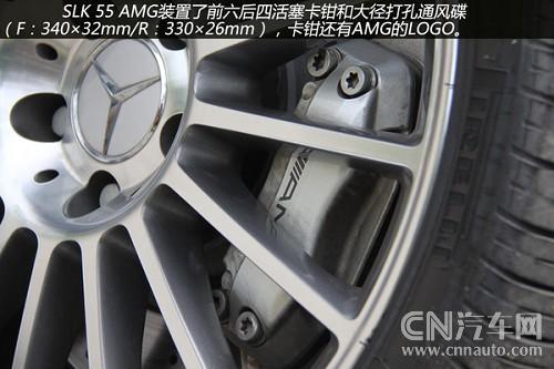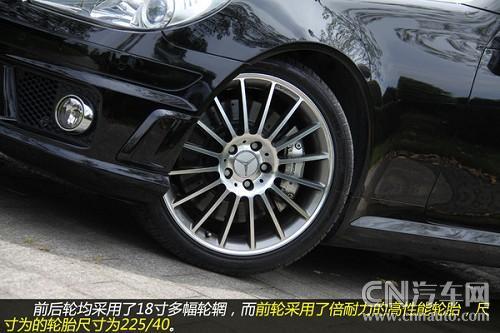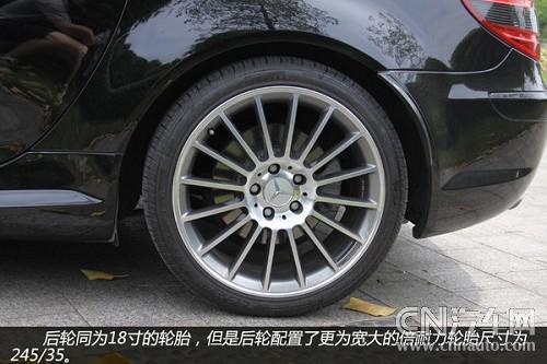 從輪轂以及剎車鉗都可以看到有AMG的標識,可以看出這些都是AMG為SLK55重新打造得。配置18吋多幅式鋁圈的SLK55AMD,配用的輪胎是前225/40、后245/35/18P-Zero紅飆。煞車因動力和車重均較小之故,只裝置了前六后四活塞卡鉗+大徑打孔通風碟(F:340×32mm/R:330×26mm),不過它的前碟中心盤采用了鋁合金的兩片式構(gòu)造,對于減輕簧下負重與抑制熱衰退肯定有正面的作用。