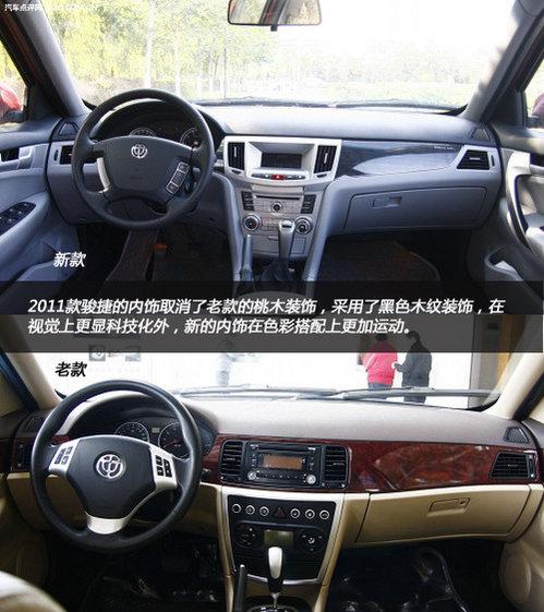 2011款駿捷的內(nèi)飾取消了老款的桃木裝飾,采用了黑色木紋裝飾,在視覺(jué)上更顯科技化外,新的內(nèi)飾在色彩搭配上更加運(yùn)動(dòng)。中控臺(tái)和老款車型差異很大,采用了大量的按鍵設(shè)計(jì),中控鎖、后備箱開(kāi)關(guān)、油箱開(kāi)關(guān)集成在最上面。新款駿捷的三幅方向盤(pán)改成了四幅式設(shè)計(jì),感覺(jué)更加穩(wěn)重。