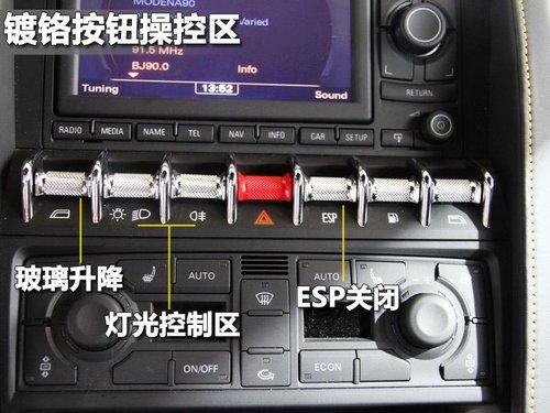 在GallardoLP 550-2多媒體音響下部,配置了一排鍍鉻按鈕,包含玻璃升降、大燈霧燈開啟、警示燈、ESP開閉、油箱開啟等多功能控制。