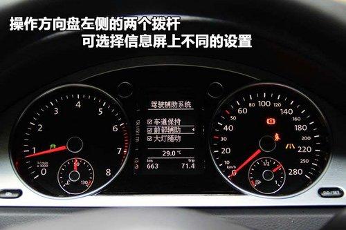 一汽-大眾CC轎跑車儀表盤雖然造型設計與邁騰略有差異,但同樣采用白色冷光背景,清晰易讀。而在轉速表和時速表中間集成了信息顯示屏,通過操作方向盤左側的兩個撥桿,可以調(diào)節(jié)和選擇不同的設置。