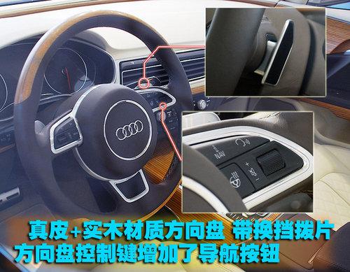方向盤部分能夠看到奧迪專為跑車化而設計的三幅運動型方向盤,通常A8的方向盤是更加舒適化的4幅方向盤。真皮縫制與實木材料的應用是奧迪為豪華車市場專門打造的。在這里我們發(fā)現了以前奧迪并未在方向盤上安裝的“Nav”即導航按鈕。