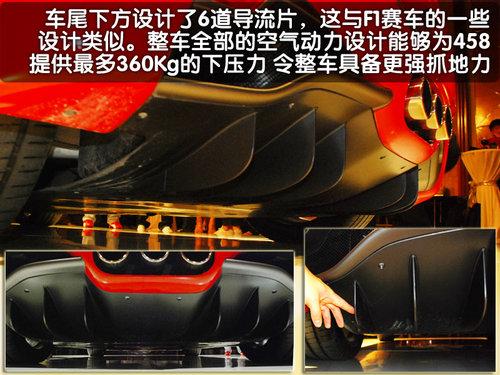 在458Italia的車尾底部,六道導(dǎo)流片在車輛高速行駛的時(shí)候?yàn)檐囕v提供充足的下壓力,以及后輪的附著力。在極限狀態(tài)下全車的因空氣動(dòng)力學(xué)設(shè)計(jì)而產(chǎn)生的額外下壓力高達(dá)360公斤,這相當(dāng)于5-7名成年人的體重總和。