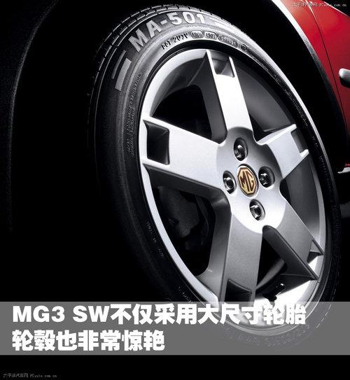 第一眼看到MG3sw,我們就會被純正的英式風(fēng)格所震撼。在MG3sw的車頭部分,我們可以看到很多分體設(shè)計的元素,前大燈、霧燈、中網(wǎng)都采用了對稱的排列方式,在蘊含動感的同時也有一絲紳士風(fēng)范。車頭和車尾低平而飽滿,引擎蓋上3道線條均勻地勾勒出一種力量感。最小離地間隙大于160mm的高通過性底盤,與車身顏色不同的全身大包圍,都表現(xiàn)出了MG3sw所具有的通過能力。