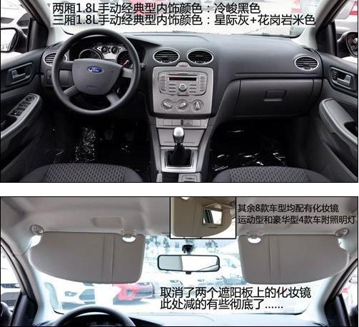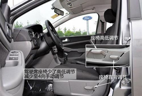 兩廂經(jīng)典型采用黑色內(nèi)飾,而三廂則采用上深下淺的顏色搭配。車內(nèi)最主要的簡(jiǎn)配有三項(xiàng),兩側(cè)遮陽板上的化妝鏡被取消,這是比較影響日常使用的。駕駛席座椅減掉了高度調(diào)節(jié)功能,變?yōu)?向手動(dòng)調(diào)節(jié)。安全配置上前排側(cè)氣囊被取消,只剩下主副駕駛正面的兩個(gè)氣囊。
