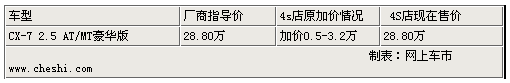 作為一款具有跑車化外觀和馬自達(dá)操控DNA的中型SUV,馬自達(dá)CX-7自去年11月上市以來一直備受關(guān)注。根據(jù)網(wǎng)上車市價(jià)格監(jiān)測(cè)系統(tǒng)顯示,自CX-7上市以來,各4S店一直持續(xù)提現(xiàn)車加價(jià)0.5萬-3.2萬元,而近期北京馬自達(dá)4S店出現(xiàn)了平價(jià)銷售現(xiàn)象,售價(jià)為廠商指導(dǎo)價(jià)28.8萬,少量現(xiàn)車供應(yīng)。具體車型價(jià)格如下: