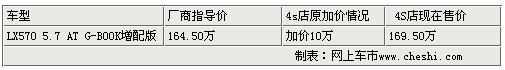 編輯從北京地區(qū)雷克薩斯4S店了解到,目前北京地區(qū)緩解了2010年初起因供應緊張的加價10萬的局面,現(xiàn)購買雷克薩斯LX系車型出現(xiàn)了較上段時間加價十萬相對優(yōu)惠的僅加價5萬的現(xiàn)車銷售,顏色有黑、白、紅少量可供選擇。如果選擇其他顏色,交車款的30%的定金,最多等待2個月消費者便可提車。如消費者有興趣的話,可以致電經(jīng)銷商處詳詢。由于北京汽車市場變化較快,各店所銷售車輛顏色可能會有所差異。