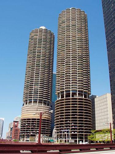 在1964年完工的這兩座雙胞胎塔,被設(shè)計成位于市中心廣場的小鎮(zhèn)——是音樂廳、零售商店、溜冰場和保齡球館的復(fù)合體。塔自身的結(jié)構(gòu)中包括了車庫:65層的塔樓下邊的三分之一是螺旋上升型的車庫,每層可容納896輛車。該車庫因1979年的故事片《亡命大捕頭》(The Hunter)而聞名,在這部電影里,史蒂夫·麥奎因扮演賞金獵人,在車庫中上演高速汽車追逐戰(zhàn)。在車庫頂部,麥奎因追蹤目標(biāo)的1980年的龐蒂亞克失去了控制,沖出了車庫,跌入下面的芝加哥河。