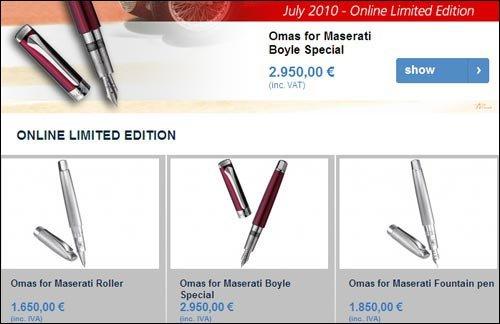 從上面的截圖可以看出,Omas for Maserati)簽字筆的售價(jià)為1650歐元,同樣銀色外觀的墨水筆售價(jià)為1850歐元,而Boyle Special是為紀(jì)念瑪莎拉蒂傳奇車型8 CTF而推出,限量生產(chǎn)70只,并且配合限量版8 CTF Boyle Special收藏車型一同發(fā)售。