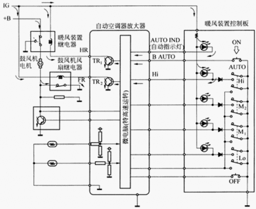 。1)鼓風(fēng)機(jī)轉(zhuǎn)速控制?照{(diào)系統(tǒng)ECU根據(jù)設(shè)定的溫度、車(chē)內(nèi)現(xiàn)有溫度、車(chē)外溫度、陽(yáng)光強(qiáng)度、蒸發(fā)器皿溫度等信號(hào),發(fā)送不同的指令給鼓風(fēng)機(jī)電機(jī),并使之搭鐵,從而控制不同的鼓風(fēng)機(jī)轉(zhuǎn)速。對(duì)于一些恒溫空調(diào)系統(tǒng),當(dāng)發(fā)動(dòng)機(jī)啟動(dòng)時(shí)或冷卻液溫度低于預(yù)定值,空調(diào)系統(tǒng)ECU使鼓風(fēng)機(jī)不起作用。