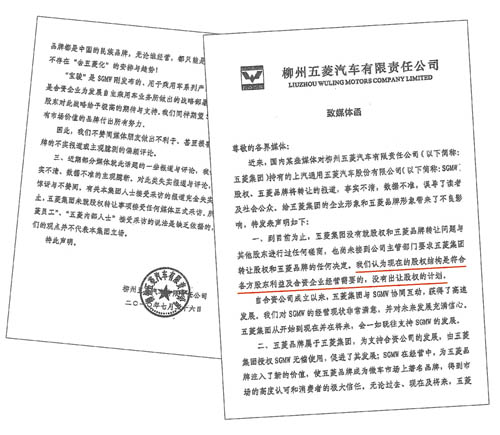 7月26日,柳州五菱汽車有限責(zé)任公司(以下簡(jiǎn)稱五菱集團(tuán))發(fā)表致媒體公開信,明確到目前為止,五菱集團(tuán)沒有就股權(quán)和五菱品牌轉(zhuǎn)讓問題與其他股東進(jìn)行過任何磋商,也尚未接到公司主管部門要求五菱集團(tuán)轉(zhuǎn)讓股權(quán)和五菱品牌的任何決定。五菱集團(tuán)認(rèn)為,現(xiàn)在的股權(quán)結(jié)構(gòu)是符合各方股東利益及合資企業(yè)經(jīng)營(yíng)需要的,沒有出讓股權(quán)的計(jì)劃……五菱集團(tuán)從開始到現(xiàn)在并在將來,會(huì)一如既往支持上汽通用五菱的發(fā)展。