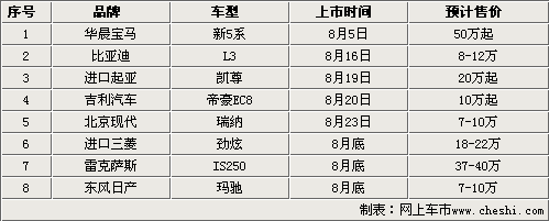 時(shí)間進(jìn)入到8月份以后,我國絕大部分城市都已經(jīng)進(jìn)入到了真正的夏天,伴隨著酷熱的天氣各大汽車廠商也紛紛選擇了盛夏時(shí)節(jié),發(fā)布他們自己的最新產(chǎn)品。據(jù)記者統(tǒng)計(jì),在2010年8月份里來自國產(chǎn)和進(jìn)口各類新車達(dá)到了8款之多,平均每周就有就有2款新車與我們見面。對于要即將上市的新車,消費(fèi)者的關(guān)注度自然是很高的,下面就讓我們提前去看看。