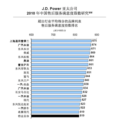2010年中國(guó)售后服務(wù)滿意度指數(shù)調(diào)研主要是衡量車(chē)主在購(gòu)車(chē)的12至24個(gè)月期間,對(duì)中國(guó)市場(chǎng)授權(quán)經(jīng)銷(xiāo)商提供的保養(yǎng)和維修服務(wù)的滿意度。報(bào)告評(píng)測(cè)了五個(gè)要素:服務(wù)質(zhì)量、服務(wù)后交車(chē)、服務(wù)啟動(dòng)、服務(wù)顧問(wèn)以及服務(wù)設(shè)施。設(shè)置總分為1000分,前三名分別獲得875、874、871的評(píng)分。
