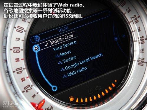 這套系統(tǒng)中整合了GPS導(dǎo)航、音響多媒體、車輛信息設(shè)置等諸多功能,最有特點(diǎn)的是其中MINIConnected這項(xiàng)功能,有了這套系統(tǒng),你可以將自己的蘋果iphone放入中央扶手,并與整套車載系統(tǒng)連接,可以延伸出更多的拓展功能,在試駕過程中我們體驗(yàn)了Web radio、谷歌地圖搜索等一系列創(chuàng)新功能,據(jù)說還可以接收用戶訂閱的RSS新聞。目前這套系統(tǒng)是否會(huì)裝備在進(jìn)入國內(nèi)的MINICountryman上我們還不得而知,但相信這種集成式的多媒體系統(tǒng)會(huì)是今后的發(fā)展趨勢。