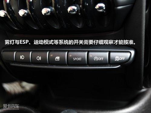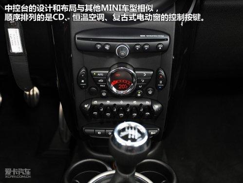 中控臺(tái)的設(shè)計(jì)和布局與其他MINI車型相似,從上而下順序排列的是CD、恒溫空調(diào)、復(fù)古式電動(dòng)窗的控制按鍵,最下面一排的位置則有些別扭,霧燈與ESP、運(yùn)動(dòng)模式等系統(tǒng)的開關(guān)需要仔細(xì)觀察才能按準(zhǔn)。