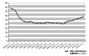 在產(chǎn)銷下滑的同時(shí),庫(kù)存開始上升。7月份,汽車庫(kù)存周期逐月增長(zhǎng)勢(shì)頭依然延續(xù),由6月份的55天增加到58天。其中,乘用車庫(kù)存周期由57天增加到60天,商用車庫(kù)存周期由49天增加到50天。
