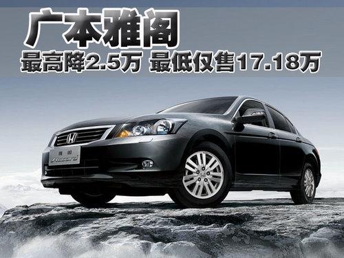 當提到中級車型大家也許會不約而同的想起廣本雅閣,新雅閣憑借其大氣的外觀、舒適的空間和豪華的配置對于中級轎車市場的構成起到了舉足輕重的作用。去年,廣汽本田又對第8代雅閣進行了小改款,對原來車型的配置有一定程度提升,部分車型增加了智能鑰匙和后遮陽板等配置,提高了雅閣整體車型的性價比。近日根據(jù)網(wǎng)上車市價格監(jiān)測系統(tǒng)顯示,目前雅閣現(xiàn)金最高優(yōu)惠2.5萬元,最低售價逼平17萬。具體價格以及優(yōu)惠幅度如下: