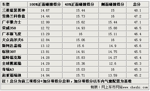 通過以上表格,我們可以看出這樣一個(gè)現(xiàn)象,12款車當(dāng)中涉及自主品牌、日韓系列和德美系列各國車型。很多人一直堅(jiān)信德美系的車要比其他兩類車要結(jié)實(shí),但事實(shí)證明他們的成績(jī)也并非那么無懈可擊?磥鞢-NCAP的鐵證也可以做一回流言終結(jié)者了,不過這12款車全部達(dá)到了45分以上,也就是C=NCAP五星級(jí)安全標(biāo)準(zhǔn)。至于傳說中的五星半級(jí)別,在比較常見的國產(chǎn)車中只有雅閣和CR-V達(dá)到。