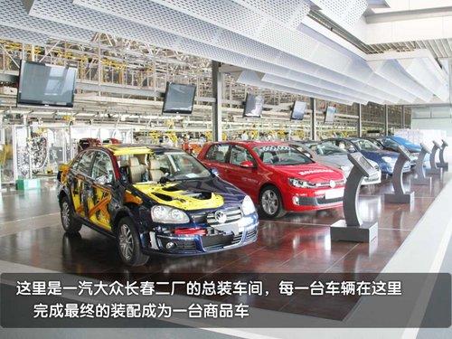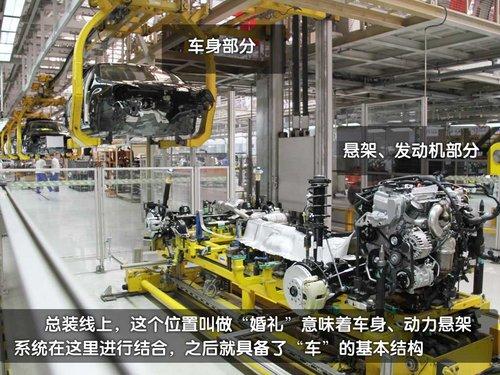 這里是一汽大眾長(zhǎng)春第二工廠的總裝車間,車輛門在這里完成“最后的儀式”。在總撞車間的門口可以看到這里生產(chǎn)的每一款車型,打頭的一臺(tái)速騰解剖車非常吸引大家的注意(我們隨后會(huì)有單獨(dú)文章詳細(xì)介紹)。從前一工序的噴漆線來(lái)到總裝線的準(zhǔn)新車都在天上“飛著”。而等到車輛從天上降落到地上之后車輛距離生產(chǎn)完畢就很快了。