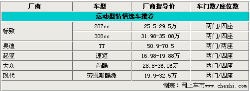 雙門跑車歷來是“小資”消費(fèi)者們的首選,時(shí)尚的外觀和出色的動(dòng)力性能足以讓您身邊喜歡運(yùn)動(dòng)、追求速度感的美女感到興奮。下面網(wǎng)上車市為您選取了308cc、奧迪TT、速邁、尚酷、勞恩斯酷派等熱銷雙門跑車。