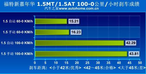 從實際的測試中也能看出,同樣搭載1.5L發(fā)動機(jī)的車型,配合5速手動變速箱就可以跑進(jìn)11秒內(nèi),而換用技術(shù)落后的4AT變速箱后加速成績則下降了將近兩秒。而在剎車方面嘉年華的表現(xiàn)一般,43米上下的成績只能算是合格水平。
