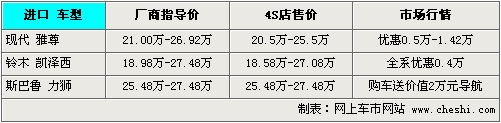在20—30萬的價格區(qū)間內(nèi),可以說進(jìn)口中級車的可選擇性并不是很多,目前銷量較為突出的則是斯巴魯?shù)牧Κ{車型,目前購買可獲贈車載導(dǎo)航,而新推出不久的鈴木凱澤西在配置上相當(dāng)完備,近期購買可獲得4千元的優(yōu)惠,進(jìn)口現(xiàn)代雅尊則是少數(shù)人的偏愛,但在優(yōu)惠幅度上最高,優(yōu)惠后最低僅售20.5萬元。