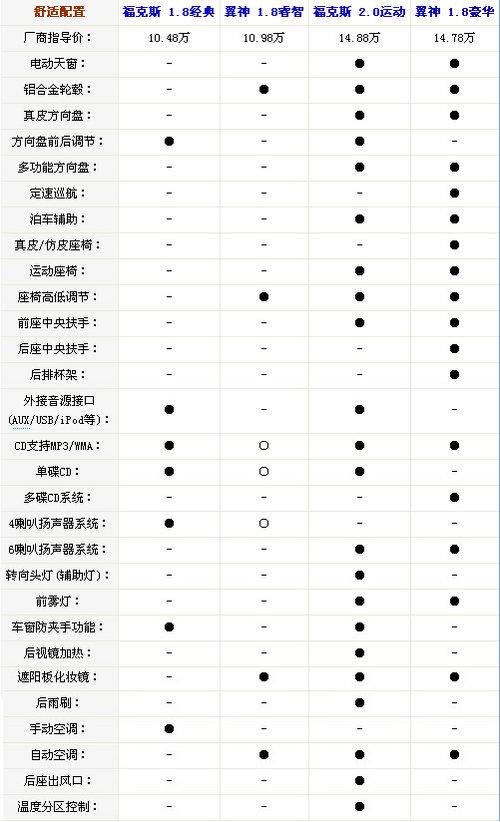從兩車的價格來看,福克斯的價格區(qū)間更靠下一些,基本保持在15萬以內(nèi),而翼神則有部分車型售價要高于這個區(qū)間。所以我們接下來的配置比較主要針對它們價格比較接近但又相對熱銷的車型,畢竟拿兩款并不是銷售主力的頂配車型對比的意義也不大。