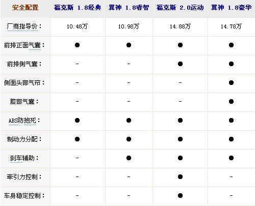 在安全配置方面,兩車的入門版車型基本保持在同一水平,正副駕駛雙安全氣囊和ABS+EBD也是目前主流的入門車型安全配置。而在較高配車型上,?怂乖谥鲃影踩嫌幸欢▋(yōu)勢,其運動版車型擁有牽引力控制和電子穩(wěn)定程序。翼神則在被動安全性上出色一些,側(cè)面頭部氣簾僅出現(xiàn)在?怂谷龓廊A型上,而全系標(biāo)配的膝部氣囊在?怂沟娜刀紱]有配備。