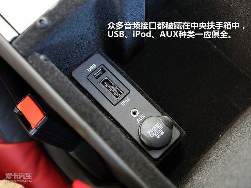 頂棚使用了突顯質(zhì)感的翻毛皮鋪陳,這種材質(zhì)同樣延伸到ABC柱。車內(nèi)大面積采用了帶暗紋的金屬飾條,相信熱衷于駕駛的人肯定會喜歡這種真皮+金屬的內(nèi)飾氛圍,中控臺設(shè)計的比較整潔,中央觸摸屏掌控了大部分功能,中控臺上只布置了一些常用功能按鍵,在實際使用過程中比較直觀,沒有難度。眾多音頻接口都被藏在中央扶手箱中,USB、IPOD、AUX種類一應(yīng)俱全。