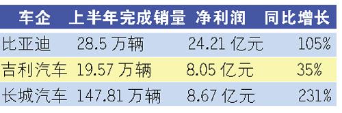 受益于上半年車市的產(chǎn)銷兩旺,三大車企的業(yè)績(jī)?nèi)飄紅,其中長(zhǎng)城汽車取代比亞迪成為業(yè)績(jī)?cè)鲩L(zhǎng)最迅速的民營(yíng)車企,吉利汽車忙于整合沃爾沃轎車業(yè)務(wù),暫時(shí)沒(méi)有突出表現(xiàn)。