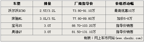 表中顯示清晰,沃爾沃XC90是四款車型中唯一一款出現(xiàn)優(yōu)惠的車型,三個(gè)版本全部?jī)?yōu)惠10萬(wàn)元,性價(jià)比表現(xiàn)比較突出;奔馳ML是四位對(duì)手中唯一一款加價(jià)車型,根據(jù)車型不同加價(jià)5-8萬(wàn)元。寶馬X5和奧迪Q7銷售情況相對(duì)穩(wěn)定,以廠商指導(dǎo)價(jià)銷售,但Q7 3.0TFSI等等時(shí)間較長(zhǎng),有5個(gè)月之多。