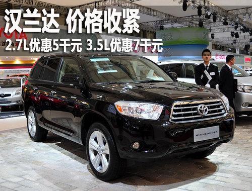 廣汽豐田生產(chǎn)的漢蘭達(dá)Highlander于2009年5月25日正式下線,擁有2.7L和3.5L兩個(gè)排量共10款車型,價(jià)格區(qū)間為24.88~42.98萬元。近期,編輯從北京廣汽豐田4S專營店獲悉,漢蘭達(dá)現(xiàn)車充足,優(yōu)惠幅度有所縮水,現(xiàn)金讓利最高7千元。詳情見下表: