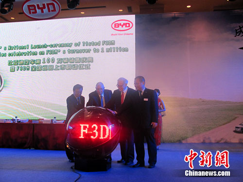 中新社深圳9月27日電(記者 鄭小紅)27日下午,隨著股神巴菲特親手將一輛F3DM鑰匙交付給比亞迪車主,比亞迪汽車迎來了銷售突破100萬輛的歷史時刻。