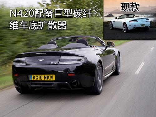 這款V8 Vantage N420敞篷車傳承了眾多賽車元素,阿斯頓馬丁標(biāo)志性的前臉與V8 Vantage Roadster相比并沒有什么差別。N420前包圍下方增加了一塊碳纖維翼子板,橢圓形頭燈內(nèi)集成有LED日間行車燈。