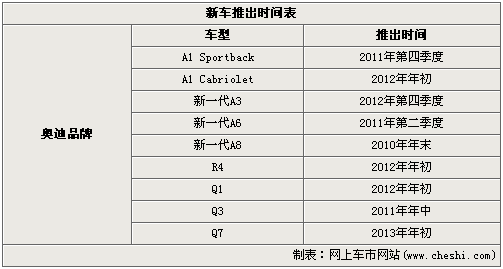 從表中可以清晰的體現(xiàn)出,奧迪品牌在未來(lái)的3年內(nèi)將推出近10款車型,其中包括品牌旗下第一款小型車A1,剛剛進(jìn)國(guó)內(nèi)A3下一大產(chǎn)品,全新新一代A6、A8,動(dòng)感跑車R4,以及SUV車型Q1、Q4以及Q7的換代車型。未來(lái)3年將推出的這些車型將為奧迪品牌的下一個(gè)“百萬(wàn)輛”銷量打下堅(jiān)實(shí)基礎(chǔ)。
