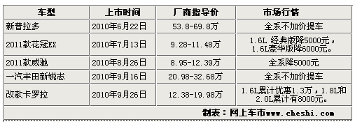 產(chǎn)品生命周期理論是美國(guó)哈佛大學(xué)教授費(fèi)農(nóng)1966年首次提出的。費(fèi)農(nóng)認(rèn)為:產(chǎn)品生命是指市上的營(yíng)銷生命,產(chǎn)品和人的生命一樣,要經(jīng)歷形成、成長(zhǎng)、成熟、衰退這樣的周期,汽車這種產(chǎn)品同樣如此。2010年,注定是一汽豐田不平凡的一年,在這這短短的不到一年時(shí)間里一汽豐田有5款換代車型上市,更新頻率創(chuàng)歷史之最。那么現(xiàn)在這幾款新上市車型的具體行情怎么樣呢?具體詳情請(qǐng)見(jiàn)一汽豐田近期5款更新?lián)Q代車型行情一覽表: