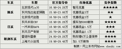 通過上表列出了8款比較熱銷的SUV車型,可以看出,主要競爭對手CRV和ix35 均無優(yōu)惠,CRV銷售方式依然高調,購車需加裝飾。其他韓日車系,優(yōu)惠幅度都在1.5萬元以上,其中獅跑和途勝最高優(yōu)惠高達3萬元,另外大眾品牌的途觀也是供不應求,購車需加1.5萬元裝飾。權衡哪一款SUV最適合自己、最具性價比,才是消費者最為關注的,下面就詳細為大家介紹一下。