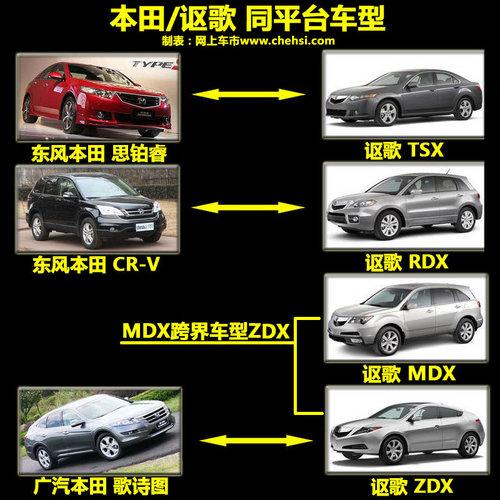 目前廣汽本田/東風(fēng)本田生產(chǎn)的部分車型都與謳歌車型同來(lái)自一個(gè)平臺(tái)。例如:東風(fēng)本田的高性能運(yùn)動(dòng)轎車思鉑睿就和謳歌TSX同平臺(tái)生產(chǎn)。同出一轍東風(fēng)本田的CR-V與謳歌RDX也存在同樣的關(guān)系。而即將上市的廣汽本田歌詩(shī)圖則是與謳歌MDX的跨界車型ZDX的平臺(tái)相同。廣汽本田歌詩(shī)圖上市后的價(jià)格明顯要比原裝引進(jìn)謳歌ZDX的價(jià)格低,當(dāng)然也更容易被中國(guó)消費(fèi)者所接受。
