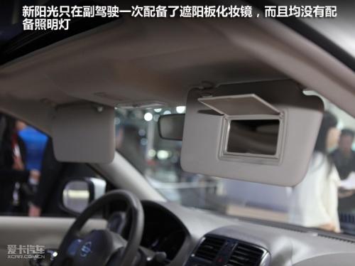 新陽(yáng)光的音響控制面板設(shè)計(jì)十分傳統(tǒng),布局與按鍵都與現(xiàn)在主流的日產(chǎn)車型一致,并沒(méi)有什么新鮮感。倒是圓形的自動(dòng)空調(diào)控制面板設(shè)計(jì)的非常可愛(ài),是新陽(yáng)光內(nèi)飾的一大亮點(diǎn),而且操作起來(lái)沒(méi)有任何難度。新陽(yáng)光只有副駕駛位置配備了遮陽(yáng)板化妝鏡,而且沒(méi)有配備照明燈,讓人有些不解。