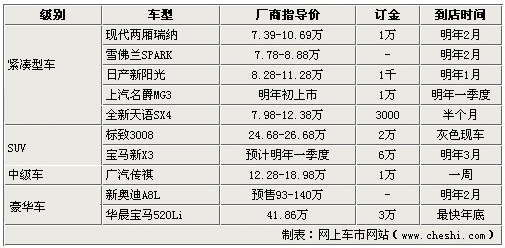 本屆廣州車展上市新車并不比北京車展多,但是所上車型基本都屬于重量級產(chǎn)品。據(jù)各廠家經(jīng)銷商銷售人員表示,十款新車大部分目前都已經(jīng)開始接受預(yù)定,并且提車時間也都集中在2011年初的第一季度,相信喜歡這些車型的朋友們?nèi)绻鍪值脑挘F(xiàn)在就可以進(jìn)行預(yù)定了。